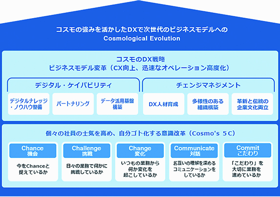 また2021年11月にはコーポーレートDX戦略部を設置。今年度は全社員参加型のCosmo’s Vision Houseを設定し〝本気のDX〞のキャッチフレーズのもとで、ビジネス変革を推進している。