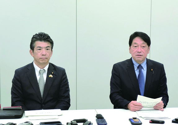 記者団の取材に応じる自民党の小野寺税調会長(右)